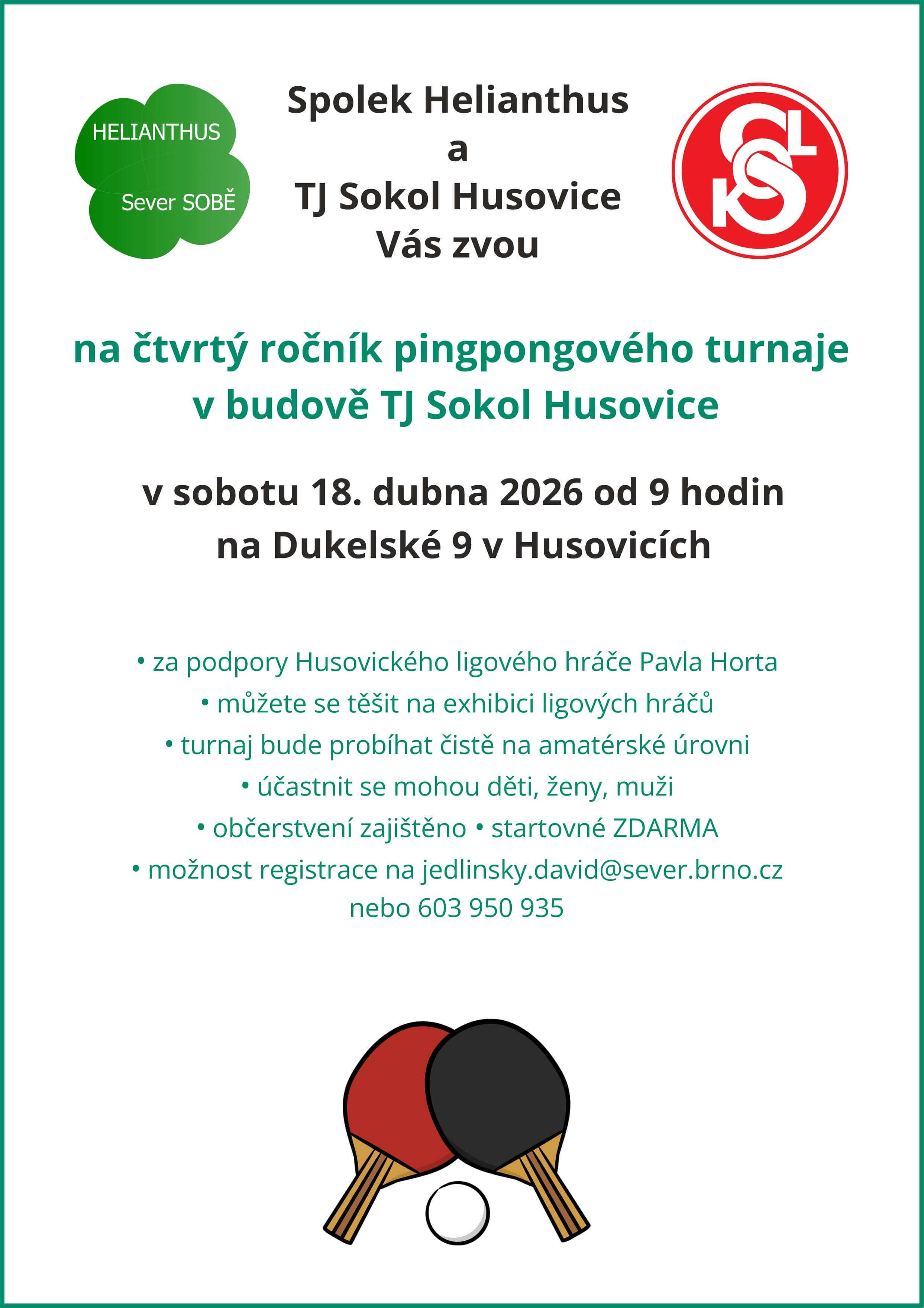 Spolek Helianthus a TJ Sokol Husovice Vás zvou na čtvrtý ročník pingpongového turnaje pro amatérské hráče.
